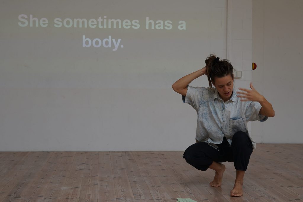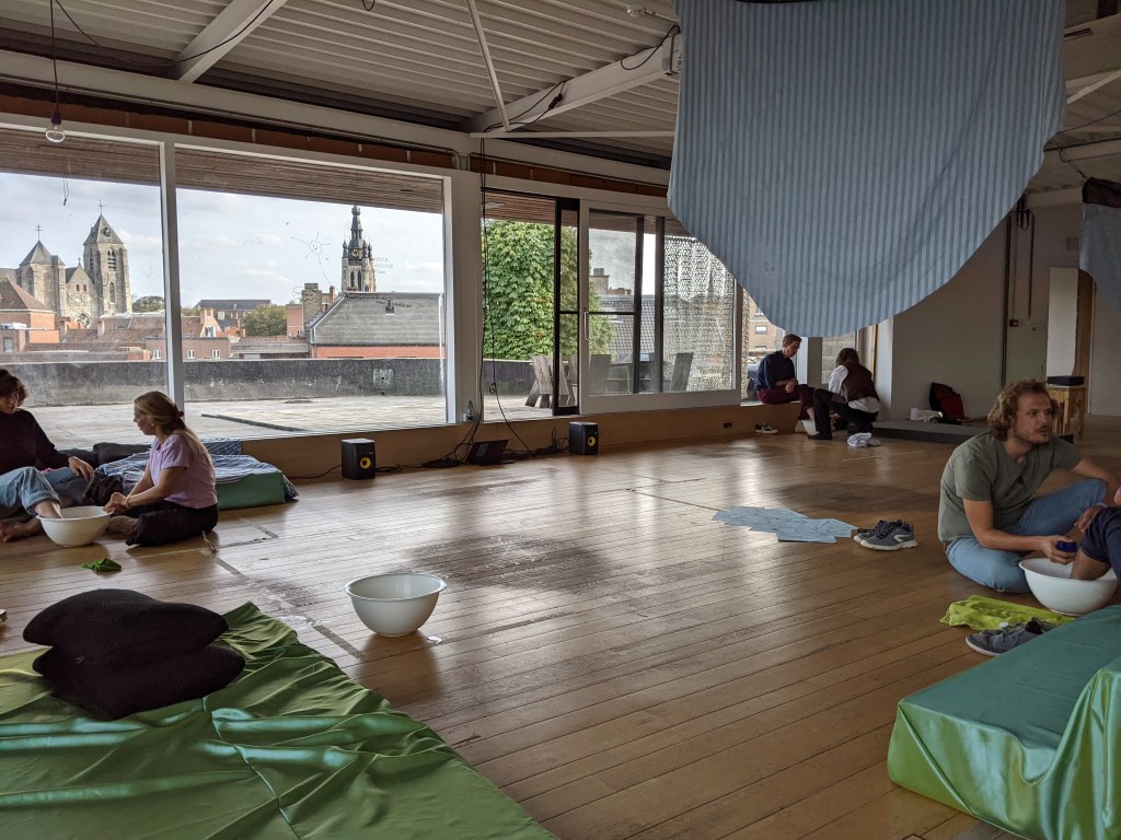 But a formative residency at Lake Studios in October 2022 played a big part in getting my ass into the studio and regenerating a rigorous movement practice towards these multifarious experiments. Many practices emerged, including an oracle singing practice, an anarchist folkdance, and folding myself up like a brokendown piece of equipment. Including erotic listening, a principle of erotic working, a radical trusting practice, and an intimate relationship with 5 Berlin-local artist peers: in the form of a self-designed “advisory/care circle”, who offered me a LOT — from mental health support to dramaturgical presence, to feedback, to preparation and then processing of what was important about what transpired during this month of intense solo work.