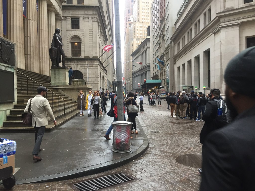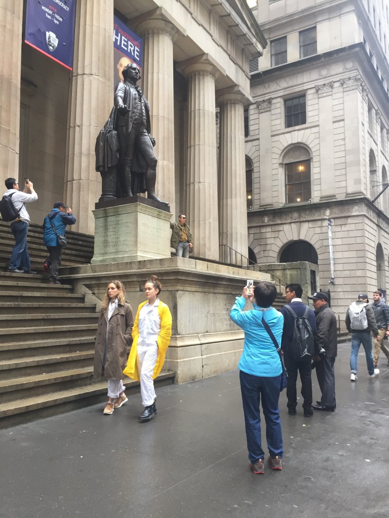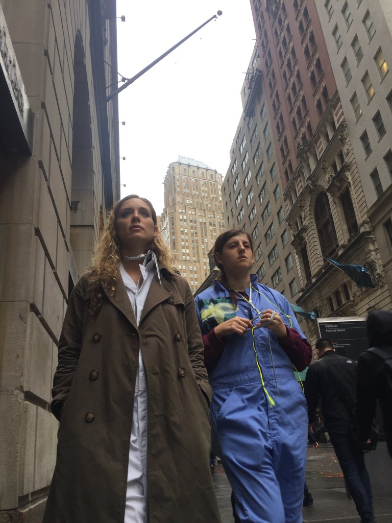 We walk at a glacial place down the 3 original blocks of Wall Street (where the infamous wall, carrying all of its unspeakable history, used to stand) during morning rush hour foot traffic, on the day of the premiere of the 2nd season of The Handmaid’s Tale. Circa 2018.